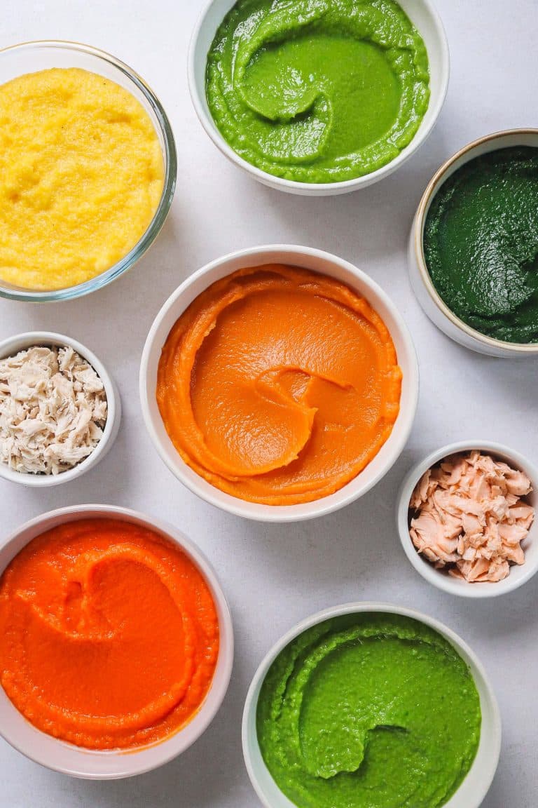 - En fonction de l’âge de votre bébé, adaptez les textures (très lisse en début de diversification, mouliné, écrasé ou en morceaux bien fondants). On vous détaille ici les étapes de mixage pour des purées lisses. ⤵️💡 Astuce : pour gagner du temps et aller plus vite, mixer à l’aide d’un mixeur plongeant dans un contenant haut et étroit (comme un verre doseur par exemple) puis remettre la purée dans le saladier ou bol. Entre chaque purée, rincez simplement le pied mixeur et le contenant à l’eau du robinet.
