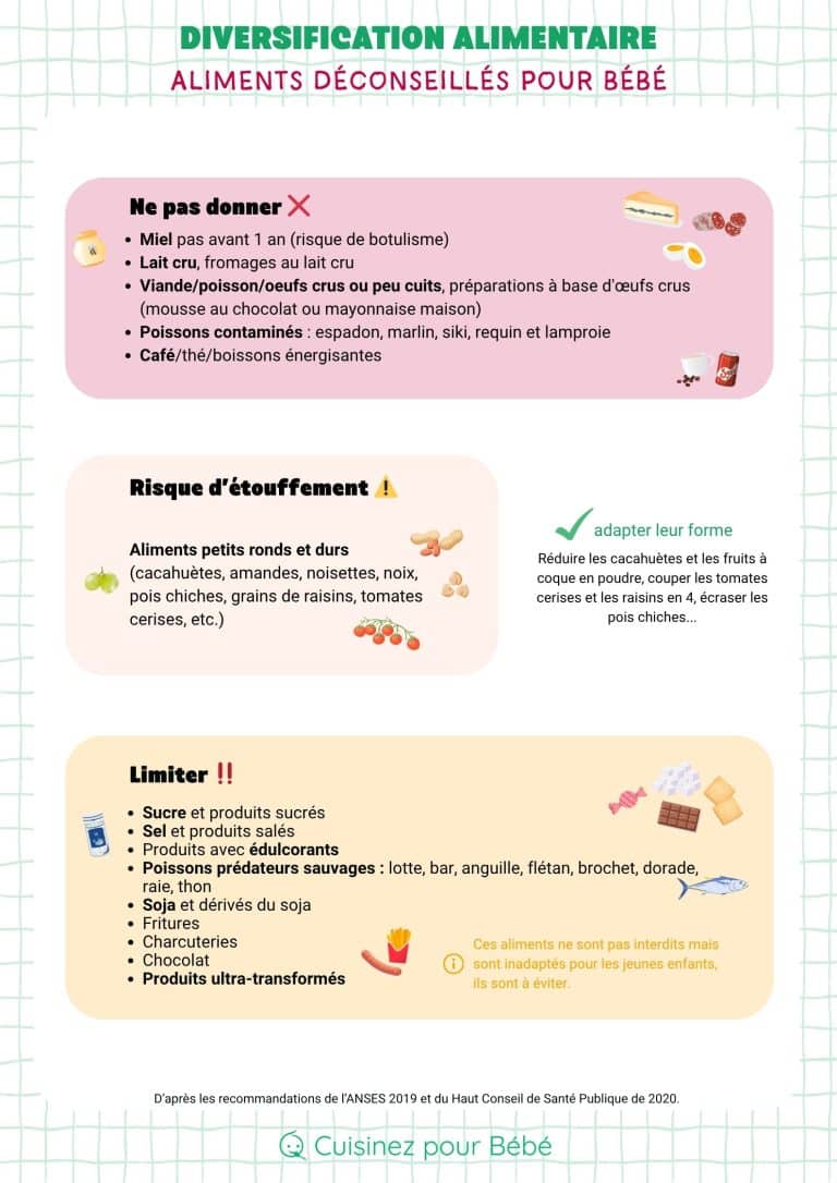 Les informations données dans ces tableaux sont issues de mes recherches sur différentes sources autour de l'alimentation infantile : PNNS, OMS, livres sur la diversification, blogs, etc. Ce n'est pas une science exacte, aussi les avis divergent selon les sources pour l'introduction de certains aliments, et les recherches sur le sujet évoluent. Si vous repérez des erreurs, des aliments manquants, ou si vous n'être pas d'accord avec l'âge d'introduction de certains aliments, n'hésitez pas à laisser un commentaire pour m'aider à mettre à jour ces tableaux (de préférence en me citant une source fiable) !