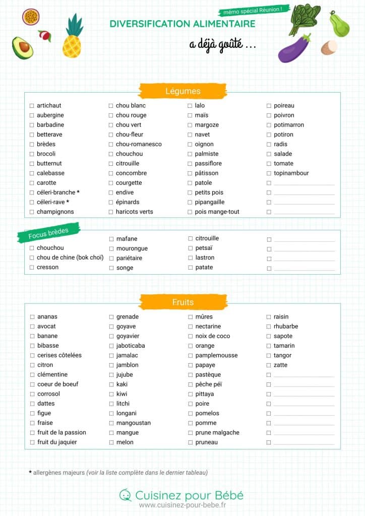 Si vous habitez sur l’île de la Réunion, nous avons adapté nos fiches mémo avec les ingrédients locaux, pour suivre ce que vous avez déjà proposé à bébé, et pour vous donner plein de nouvelles idées d’aliments à lui faire goûter ! N’hésitez pas aussi à consulter notre dossier spécial « Diversification à la Réunion » !