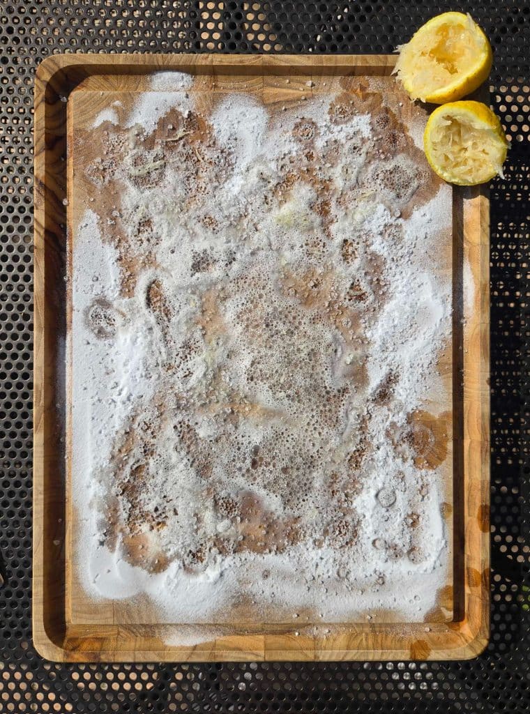 Rincez la planche à l’eau chaude pour enlever le mélange sel-bicarbonate-citron, puis séchez soigneusement.